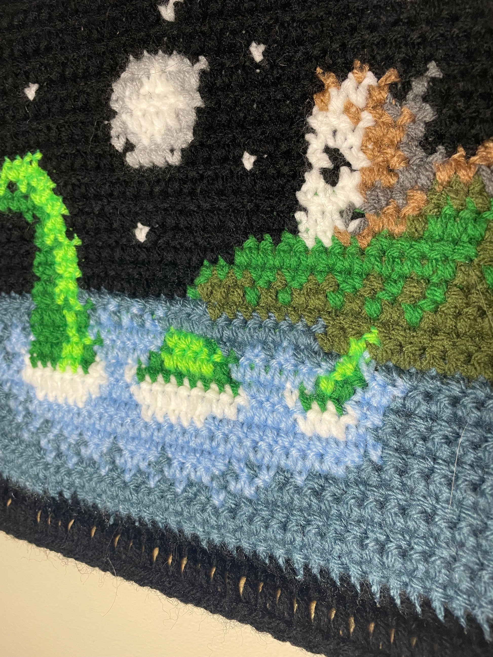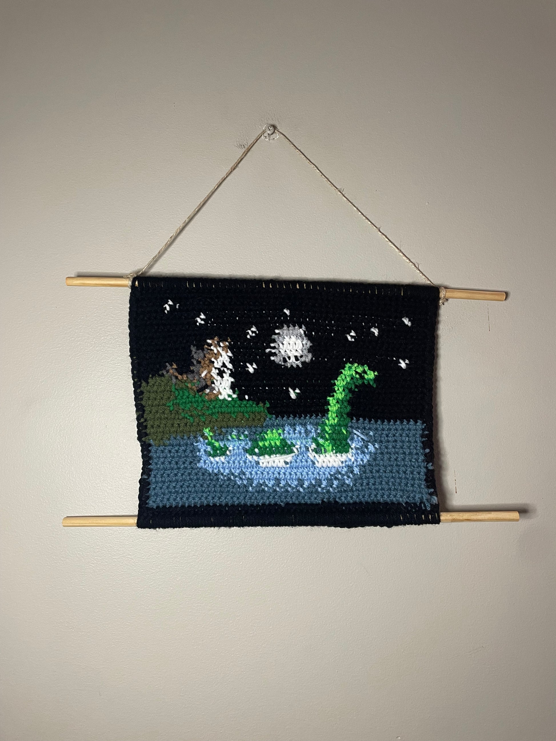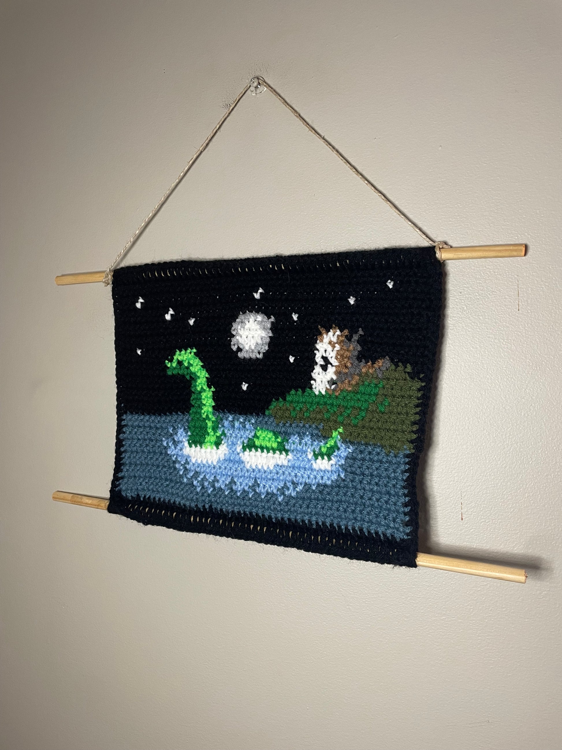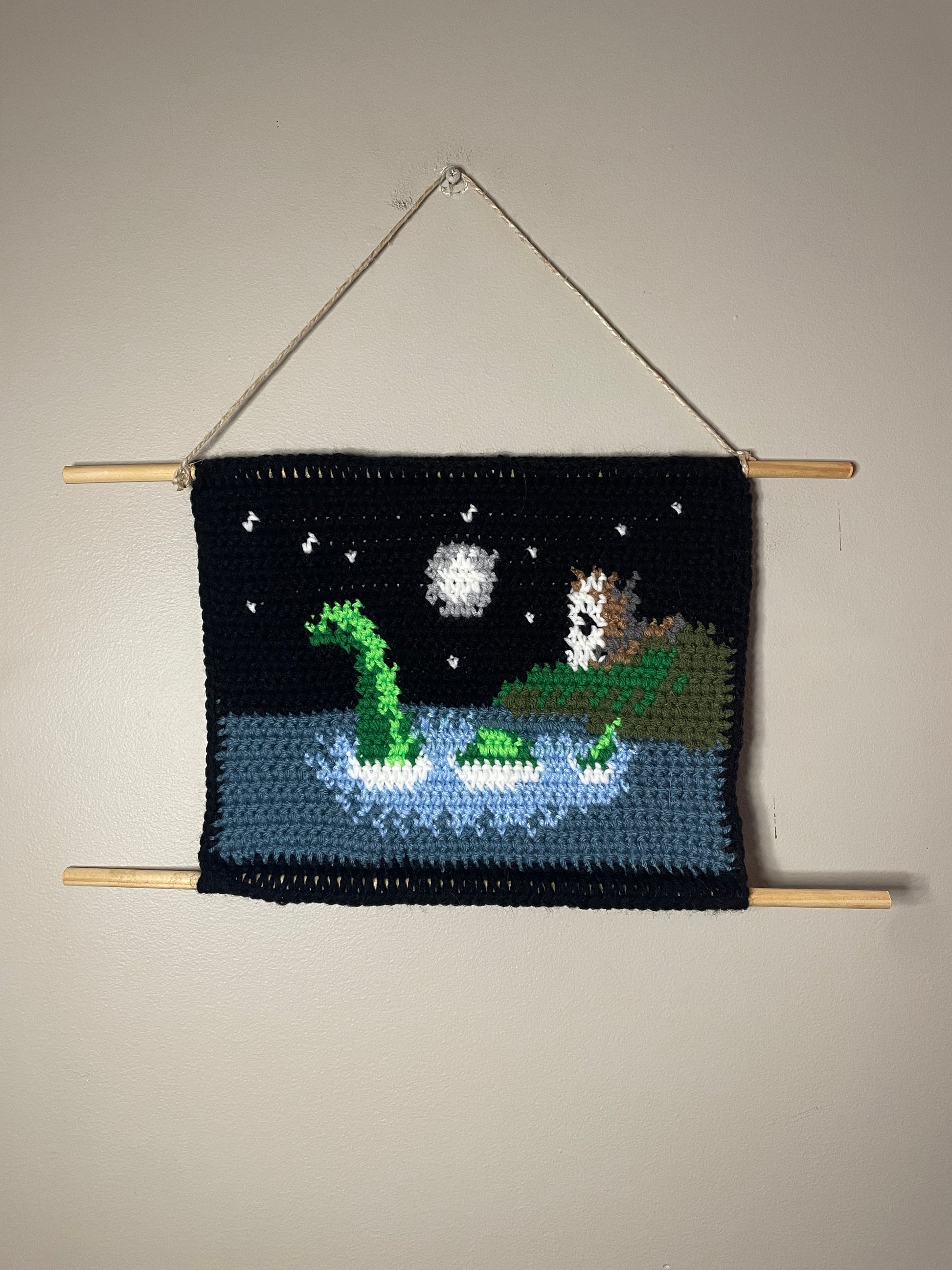 Crochet moonlight Nessie tapestry mounted on wooden dowel rods and hung with hemp cord. Tapestry measures 11.5” wide and 9” tall. Dowel rods measure 16”. Original pattern (made for cross stitch) by 123stitch.com.
